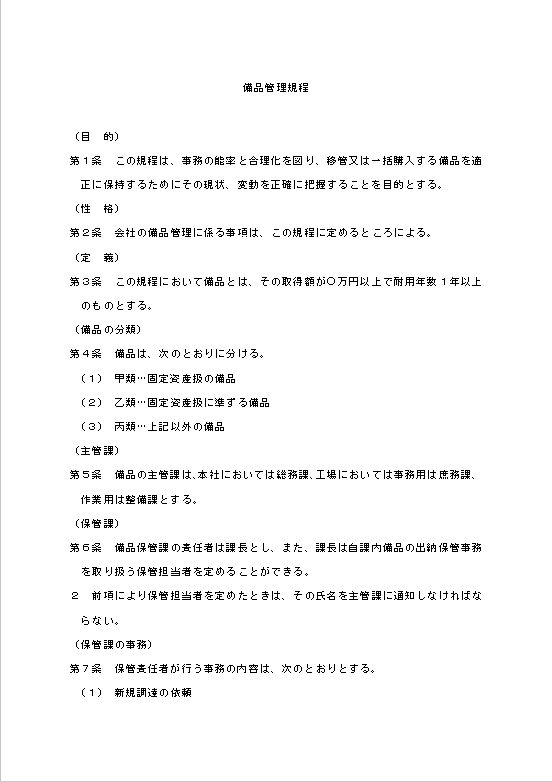 第1条 この規程は、事務の能率と合理化を図り、移管又は一括購入する備品を適正に保持するためにその現状、変動を正確に把握することを目的とする。