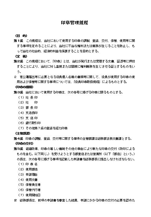 第1条 この規程は、当社において使用する印章の調製、登録、交付、保管、使用等に関する事項を定めることにより、当社に不当な権利または義務が生じることを防止し、もって当社の社会的、経済的利益を保護することを目的とする。