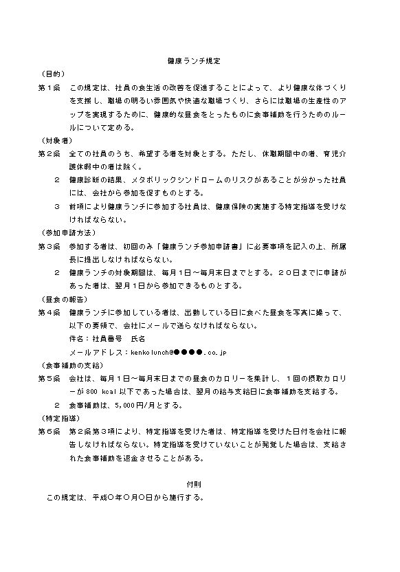 第1条 この規定は、社員の食生活の改善を促進することによって、より健康な体づくりを支援し、職場の明るい雰囲気や快適な職場づくり、さらには職場の生産性のアップを実現するために、健康的な昼食をとったものに食事補助を行うためのルールについて定める。