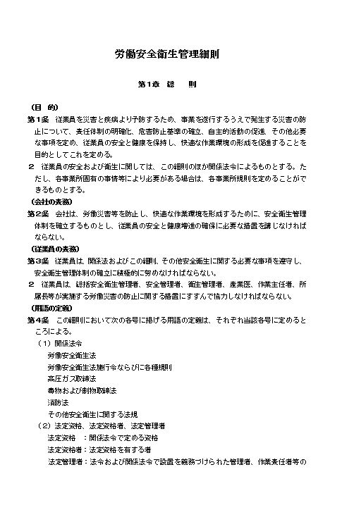 第1条 従業員を災害と疾病より予防するため、事業を遂行するうえで発生する災害の防止について、責任体制の明確化、危害防止基準の確立、自主的活動の促進、その他必要な事項を定め、従業員の安全と健康を保持し、快適な作業環境の形成を促進することを目的としてこれを定める。