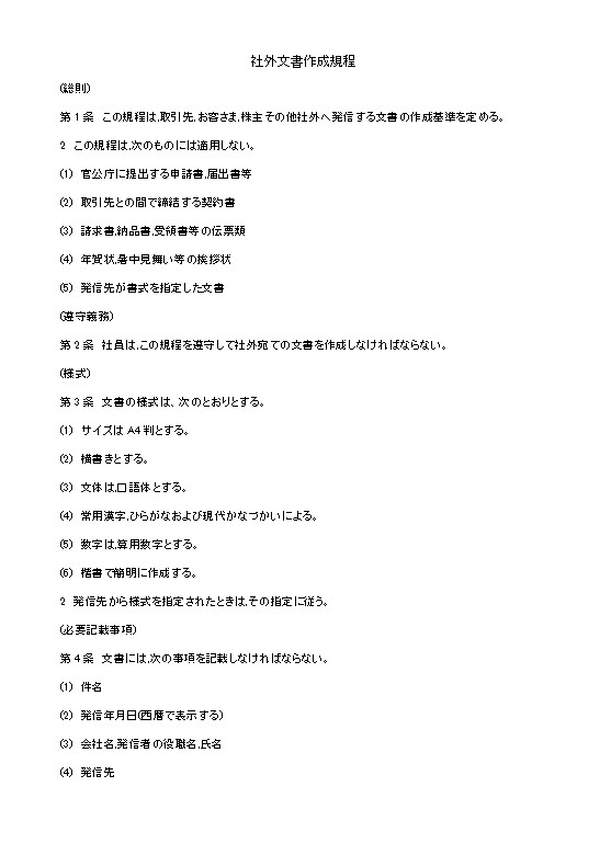 第1条 この規程は,取引先,お客さま,株主その他社外へ発信する文書の作成基準を定める。