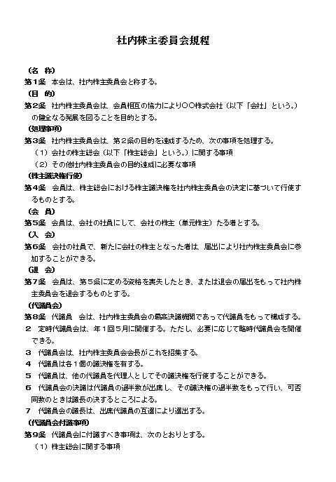 第2条 社内株主委員会は、会員相互の協力により○○株式会社(以下「会社」という。)の健全なる発展を図ることを目的とする。