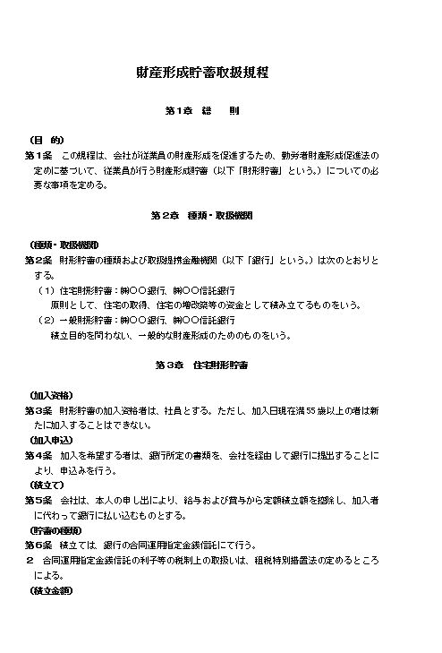 第1条 この規程は、会社が従業員の財産形成を促進するため、勤労者財産形成促進法の定めに基づいて、従業員が行う財産形成貯蓄(以下「財形貯蓄」という。)についての必要な事項を定める。
