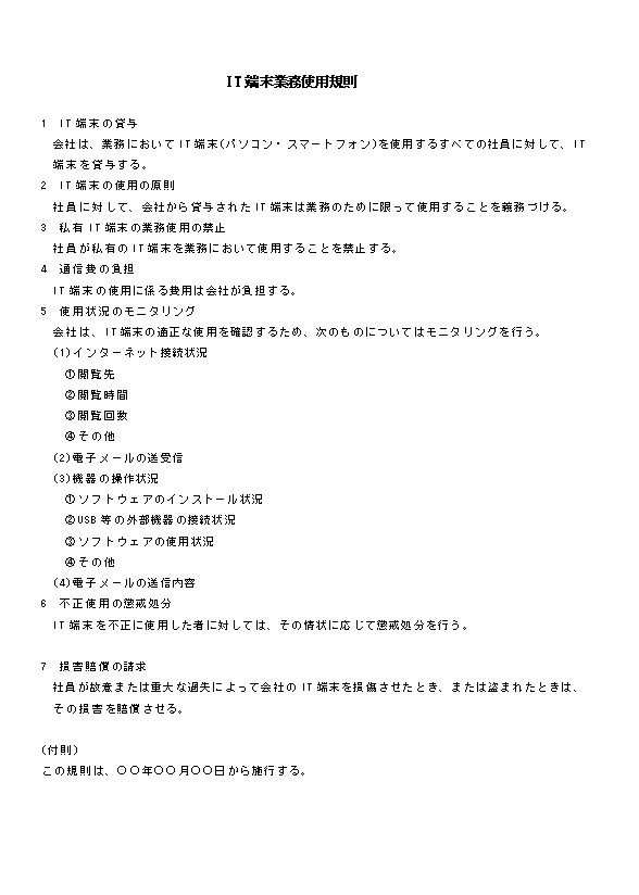 社員に対して、会社から貸与されたIT端末は業務のために限って使用することを義務づける。