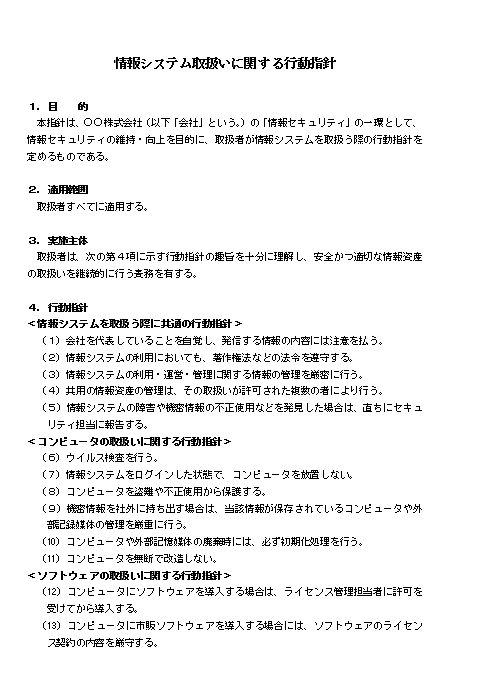 本指針は、○○株式会社(以下「会社」という。)の「情報セキュリティ」の一環として、情報セキュリティの維持・向上を目的に、取扱者が情報システムを取扱う際の行動指針を定めるものである。