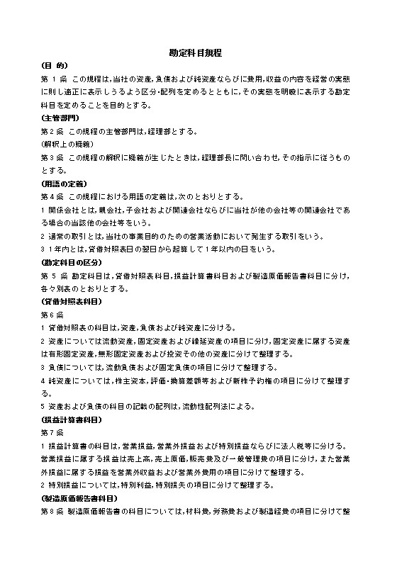 第1条 この規程は,当社の資産,負債および純資産ならびに費用,収益の内容を経営の実態に則し適正に表示しうるよう区分·配列を定めるとともに,その実態を明瞭に表示する勘定科目を定めることを目的とする。