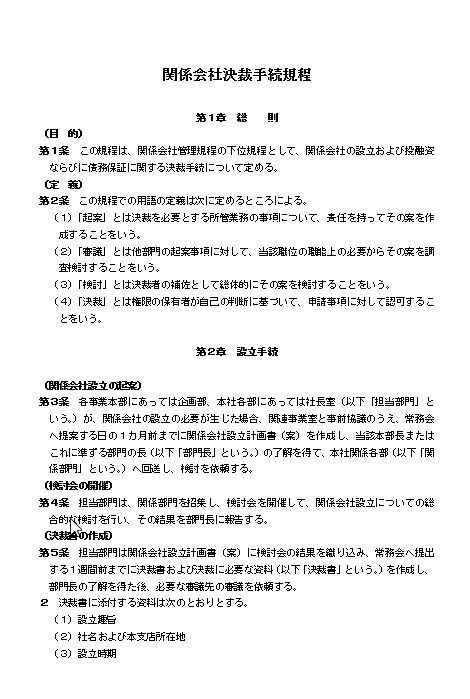 第1条 この規程は、関係会社管理規程の下位規程として、関係会社の設立および投融資ならびに債務保証に関する決裁手続について定める。