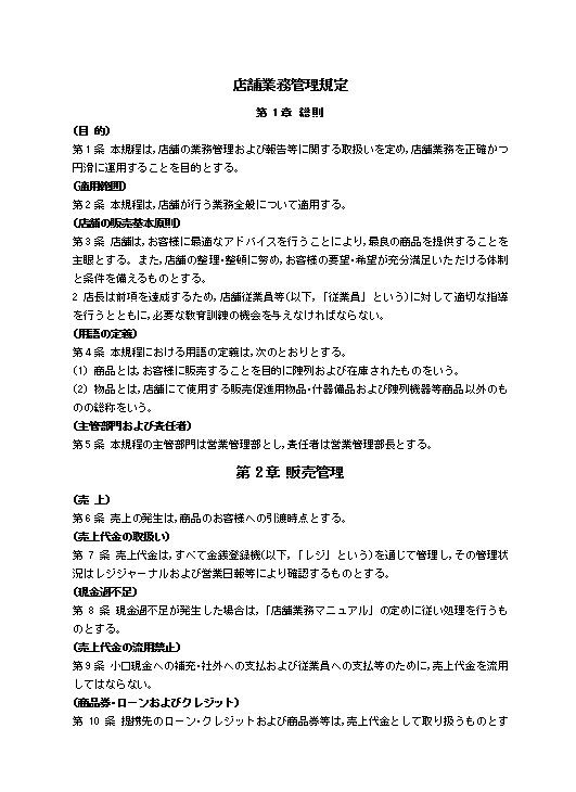 第1条 本規程は,店舗の業務管理および報告等に関する取扱いを定め,店舗業務を正確かつ円滑に運用することを目的とする。