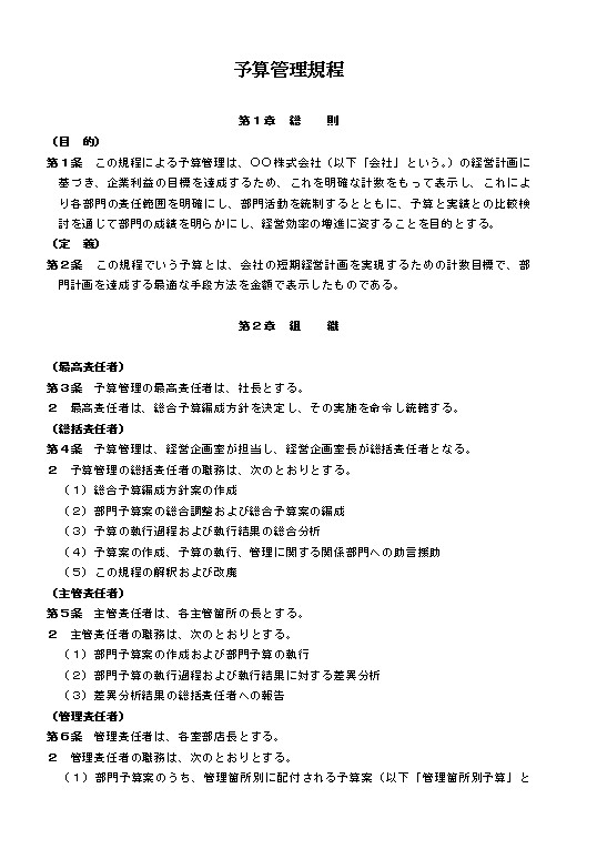 第1条 この規程による予算管理は、○○株式会社(以下「会社」という。)の経営計画に基づき、企業利益の目標を達成するため、これを明確な計数をもって表示し、これにより各部門の責任範囲を明確にし、部門活動を統制するとともに、予算と実績との比較検討を通じて部門の成績を明らかにし、経営効率の増進に資することを目的とする。